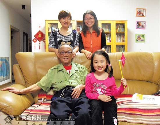 | 现年71岁的黄克发和大女儿黄冬梅、小女儿黄咏梅(后右)以及外孙女在柳州的家里。