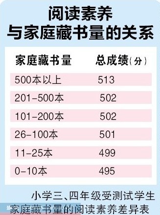 数据:在对小学三、四年级学生的测试显示,家庭藏书量500本以上的学生,其阅读素养最高,平均分达到512分;其次是家庭藏书量在100本以上的学生,其阅读素养和藏书量为26-100本的学生接近。