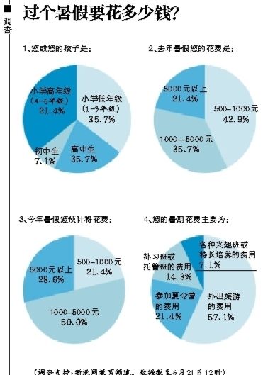根据本报与新浪网关于“你暑期准备花多少钱”的联合调查结果显示,中小学生暑期消费市场也是水涨船高。截至6月20日晚上10点,调查结果显示,去年学生在暑假花费500-1000元这一档次上所占比例最高位42.9%,其次是1000-5000元选项所占比例为35.7%。相对于上世纪80年代暑假学生几乎不花钱的情况,现在500元以下的花费选项没有人选。而今年1000-5000元成主流消费水准,所有参加调查的人员一半都选择今年预计将在暑假花费这么多钱。也有将近3成填写调查问卷的读者选择花费将在5000元以上。