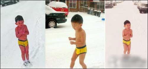 | 中国父亲暴雪中训练4岁儿子裸跑