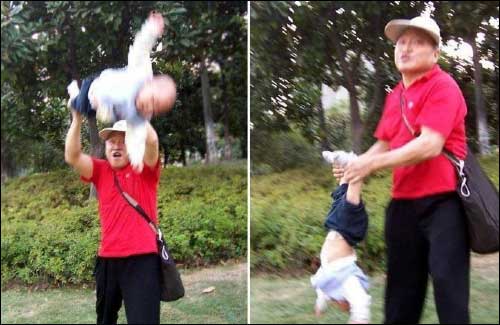 2009年10月8日,网友“王浩峰”在其博客撰写一篇博文:《叹服!武汉老汉带孙儿奇特方法》,这篇博文经网上论坛转发后,引发众多网友激辨。该博主称2009年“十·一”长假期间,他在武汉一处公园亲眼所见,一位姚姓老汉,将才7个月大的孙子,反拎着双脚或双手,将其身体使劲儿地往高空抛甩,一次多时能抛甩30余个回合,围观的市民无不心悬,捏一把汗。老汉说这有利于孩子健康成长,称大孙子也是这样每天抛甩长大的,身体好得很。”最后,该网友还在文中很谨慎地提醒各位网友,“千万不要盲目模仿哟,人家老先生是中医出身,千抛万摔婴幼儿关节不脱臼,是有诀窍的。”