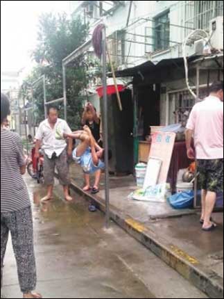 2011年8月,位于浦东新区栖霞路崂山路的崂山四村内发生一幕骇人的家庭暴力:一对父母将12岁的儿子用麻绳吊起来,挥着皮带抽打了近半小时。