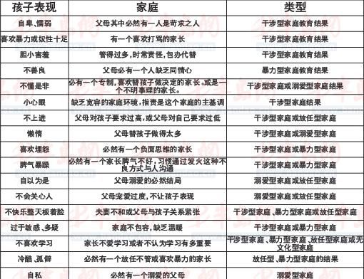 而每种孩子的表现都对应一种家庭教育的情况,比如,孩子自卑和懦弱的表现,反映出父母之中必然有一人是苛求之人。另外,表格还分了干涉型家庭教育结果、暴力型家庭教育结果、溺爱型家庭教育结果等多种家庭教育类型。