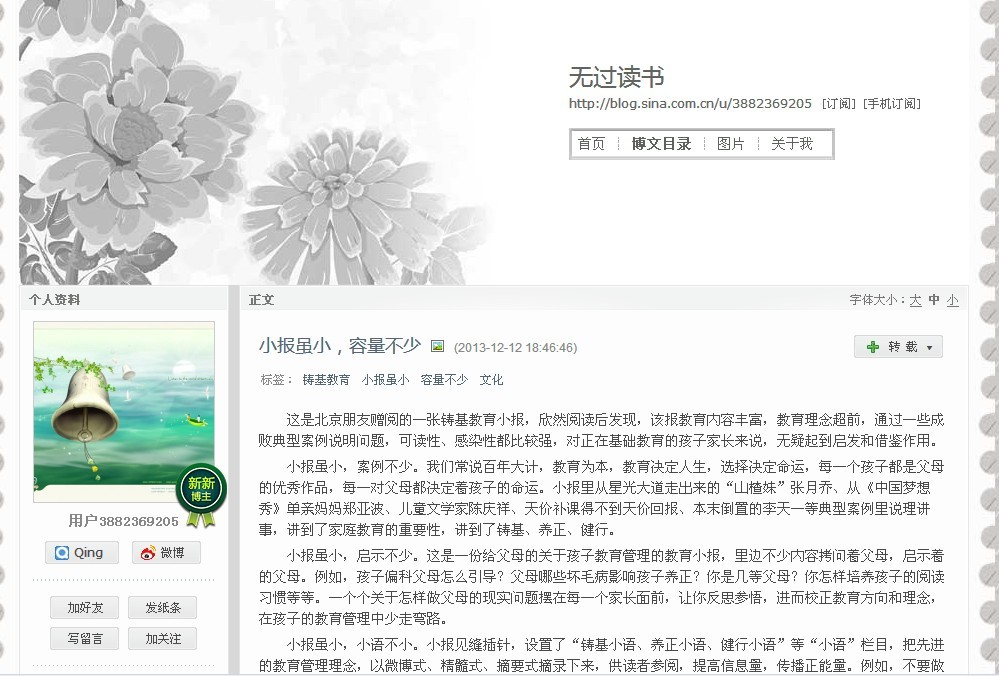 | 这是北京朋友赠阅的一张《铸基教育》小报(该小报内部交流所用——编者注),欣然阅读后发现,该报教育内容丰富,教育理念超前,通过一些成败典型案例说明问题,可读性、感染性都比较强,对正在基础教育的孩子家长来说,无疑起到启发和借鉴作用。