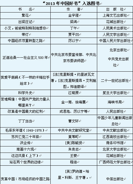 | 伴随着春天的花香,世界读书日携书香而来。由我国权威的图书评测机构中国图书评论学会主办,旨在“为好书寻找读者、为读者发现好书”的“2013年中国好书”评选结果在这一天新鲜出炉。