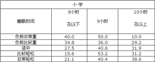 调查中,询问了“你在平时的学习中感觉学习负担怎么样”的问题,小学生回答“负担非常重”占3.1%,“负担比较重”占9.3%,“适中”占49.6%,“比较轻松”占26%,“非常轻松”占12%;中学生回答“负担非常重”占6.3%,“负担比较重”占22.7%,“适中”占60.6%,“比较轻松”占9%,“非常轻松”占1.4%。中小学生睡眠时间与学习负担交互分析结果如下表: