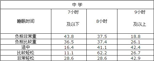 统计结果表明,从整体上看无论是小学生还是中学生,都是学习负担越重睡眠时间越少。尤其是表示“负担非常重”睡眠达标的小学生只有一成,中学生不足两成。