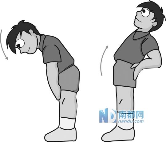 动作:向前弯腰,向后弯腰;左手举起向右弯,右手举起向左弯。