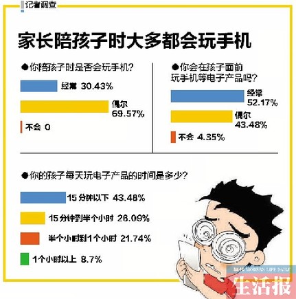 “你会在孩子面前玩手机吗?”昨日,记者就此调查了23个家长,其中妈妈16人、爸爸7人。23个家长中,经常在孩子面前玩手机的占52.17%,偶尔在孩子面前看手机的占43.48%,不会在孩子面前玩手机的占4.35%;而在陪孩子过程中,偶尔看手机占了69.57%,经常看手机占了30.43%,不会看手机的为0。