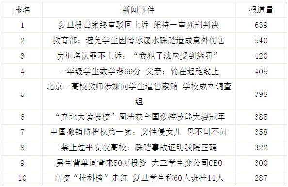 | 上周,新年带来的欢乐祥和,掩不住舆论的纷争与躁动。与往常相比,教育热点事件每天都有发布,舆情走势始终居高不下。在排名前10的一周舆情榜上(如表所示),媒体报道量超过300篇次的新闻事件多达9条。
