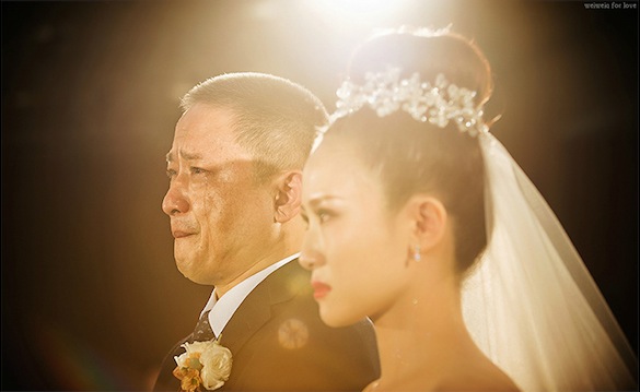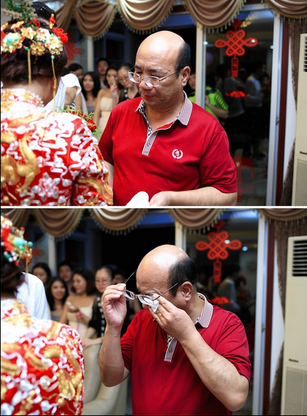 婚礼那天,敬茶礼成时,父亲一直说“我今天把女儿交给你了,就交给你了……”,随后,他口角微抿,眼睑泛红……