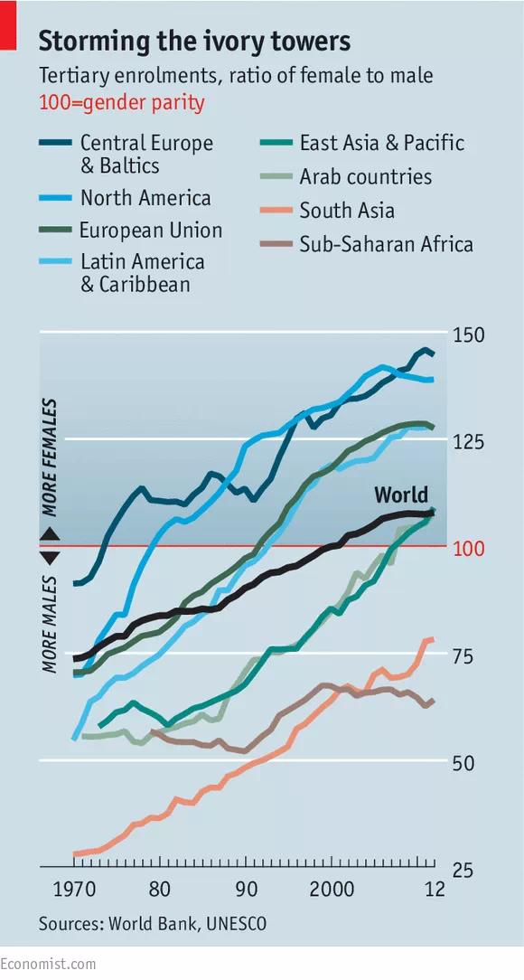 尽管在经济合作与发展组织调查的一些国家里,女性只占了大学生的少部分,这个比例也在逐年增长。同时,在一些精英高校中女性的数量也越来越多。男女在能力上的平等已经成为共识。