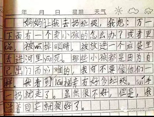 读了这个八岁孩子的作文,心里堵得慌。这么小的孩子就生活在无名的恐惧之中!国人啊,你究竟犯下了什么样的重罪,才会让你们的孩子从小就生活在这样的世界啊?!