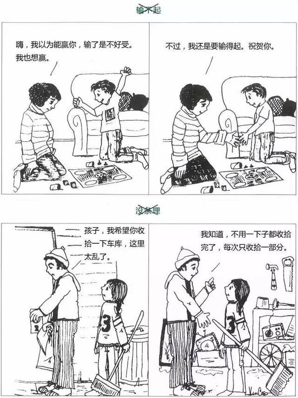 如果家长给孩子示范输不起,仅仅告诉孩子说“你看我输了都不生气”,这样的示范没有意义。要让孩子明白他的感受是正常的,是可以接纳的,但是行为是需要克制的。“我也很想赢,我输了也很难过,不过还是要祝贺你。”这样的示范才真实而有意义。
