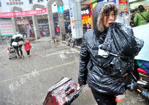1月31日,湖北省武汉大雪纷飞,在汉口金家墩长途汽车站前,一位回家的母亲抱着不会走路的孩子,右手拉着行李箱赶路,左手因无法护着怀里的孩子,只好用嘴紧紧地咬着裹孩子的衣服的帽子,不让风雪冻坏了孩子。