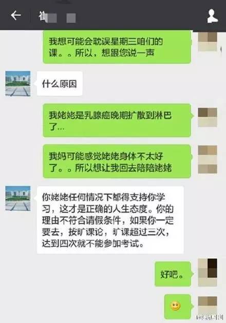 该校商学院称,为加强学风建设和确保学生安全,商学院要求教师从严执教,严抓课堂出勤纪律,严格请销假管理。微博中的这位老师平时教学态度认真,对课堂出勤一直要求严格。经过沟通,教师已批准该生请假,该生已于11月28日返回家中探视老人。