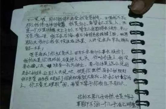 在这十五年里,我感谢我的爷爷奶奶,是他们教我学会了为人处事,但是我的爸妈在(这)些年里没有一天是他们照顾我一天过,但我不恨他们,因为他们有很大的负担。但是,我希望我父亲改改脾气,不要那么火爆,每一个人都有一颗自己的心,人心隔肚皮,我不知道他们的心事什么颜色,为什么要逼得子女自杀。