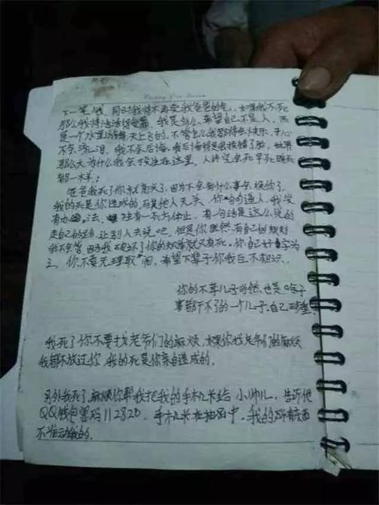 爸爸,我死了,你就高兴了,因为不会有什么事会烦你了,我的死是你造成的,与其他人无关。你句句逼人,我没有办法,独有一死方休止。有一句话是这么说的,走自己的路,让别人去说吧,但是你既然有自己的规则我不会管,因为我破坏了你的规举(矩)就只有死,你自己好字(自)为之,你不要无理取闹,希望下辈子你我互不相识。