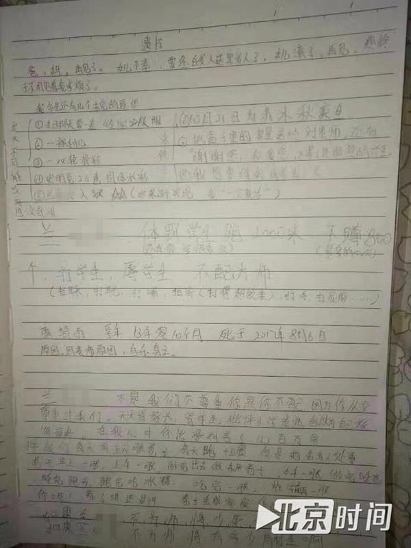 遗书还称老师对学生有体罚行为,“兰兵体罚学生跑1000米(还有很多很多次)、下蹲800个(最多的一次),打学生、辱学生、不配为师(扯耳朵、打耳光、打嘴、打手、打屁股……)”