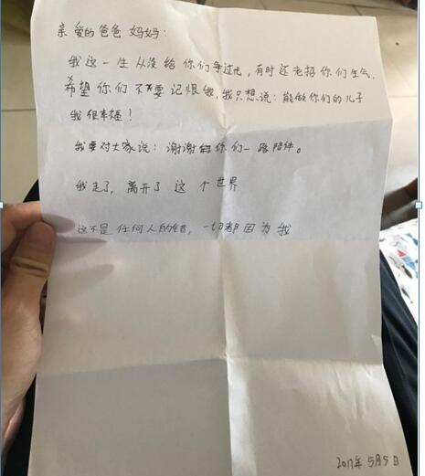 “亲爱的爸爸妈妈,我这一生从没有给你们争过光,有时还老招你们生气,希望你们不要记恨我,我只想说能做你们的儿子我很幸福!我要对大家说,谢谢你们一路陪伴。我走了,离开了这个世界,这不是任何人的错,一切都因为我。2017年5月5日”