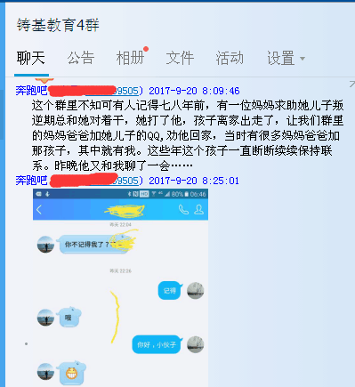 “这个群里不知可有人记得七八年前,有一位妈妈求助她儿子叛逆期总和她对着干,她打了他,孩子离家出走了,让我们群里的妈妈爸爸加她儿子的QQ,劝他回家,当时有很多妈妈爸爸加那孩子,其中就有我。这些年这个孩子一直断断续续保持联系。昨晚他又和我聊了一会……”