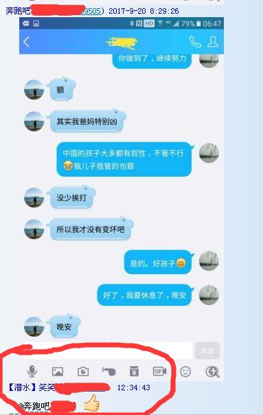 “奔跑吧,××”在说了上面一段话后,接着发出几个和那位孩子聊天的截屏。我相信凡是看了这段话和截屏的家长都会认为“奔跑吧,××”是位非常有心的“家庭教育专家”,跟踪服务也做的非常到位,有图有真相,您不得不相信这是真的,事实上也真有家长给这位“专家”点赞。