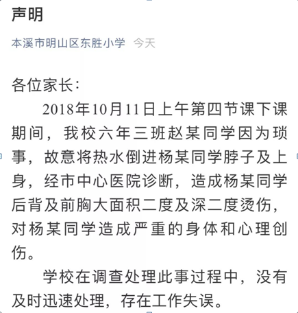 11月9日,有网友发帖称辽宁本溪市一小学生往同学身上倒热水,造成同学后背及前胸大面积二度和深二度烫伤。而伤人同学的母亲在该校担任副校长。昨天,学校声明称,决定给予花启国校长党内警告处分,免去张莹莹同志东胜小学副校长职务,并调离本校。