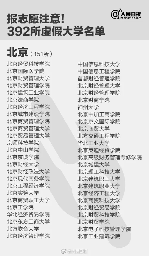 人民日报6月26日消息,近日,各地高考成绩陆续公布,马上要报志愿,警惕这些虚假大学陷阱!这些学校部分仿冒正规高校的校名,学校简介多是抄袭拼凑而成,部分“野鸡学校”被曝光多次仍换个域名继续存在。全国392所“野鸡大学”名单。