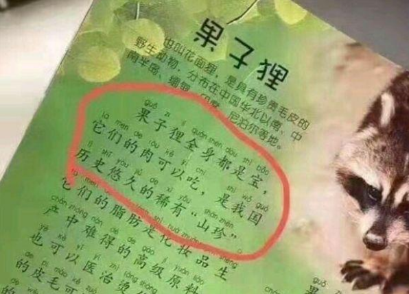 “果子狸全身都是宝,它们的肉可以吃,是我国历史悠久的稀有‘山珍’,它们的脂肪是化妆品生产中难得的高级原料,也可以医治烫伤,它们的皮毛可做皮手套,它们的尾毛和针毛,可以制成毛刷和画笔。”在部分网友反映的这本儿童读物中关于果子狸的介绍,引发网友抗议。