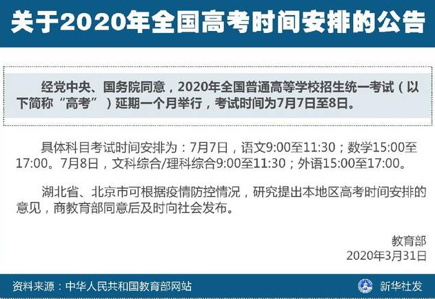 据新华社消息,记者3月31日从教育部获悉,经党中央、国务院同意,2020年全国普通高等学校招生统一考试延期一个月举行,考试时间为7月7日至8日。