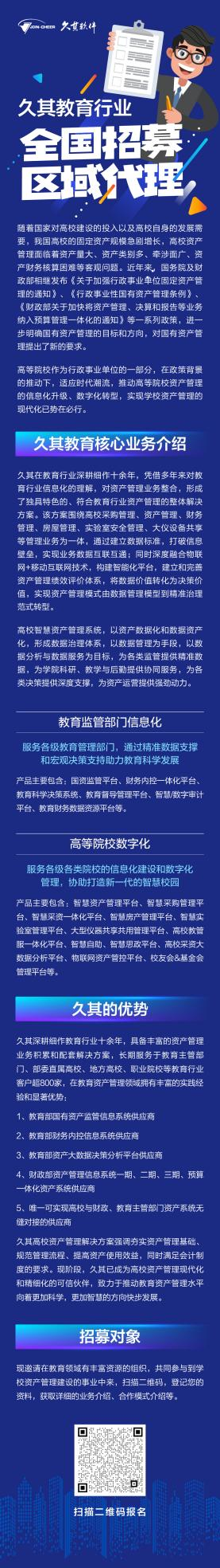 | 在国家新一轮教育信息化建设的政策引领下,久其教育事业部启动全国经销商招募计划。我们邀请有志之士加入我们的行列,共同开启高校资产管理的创新之旅,共创共赢。